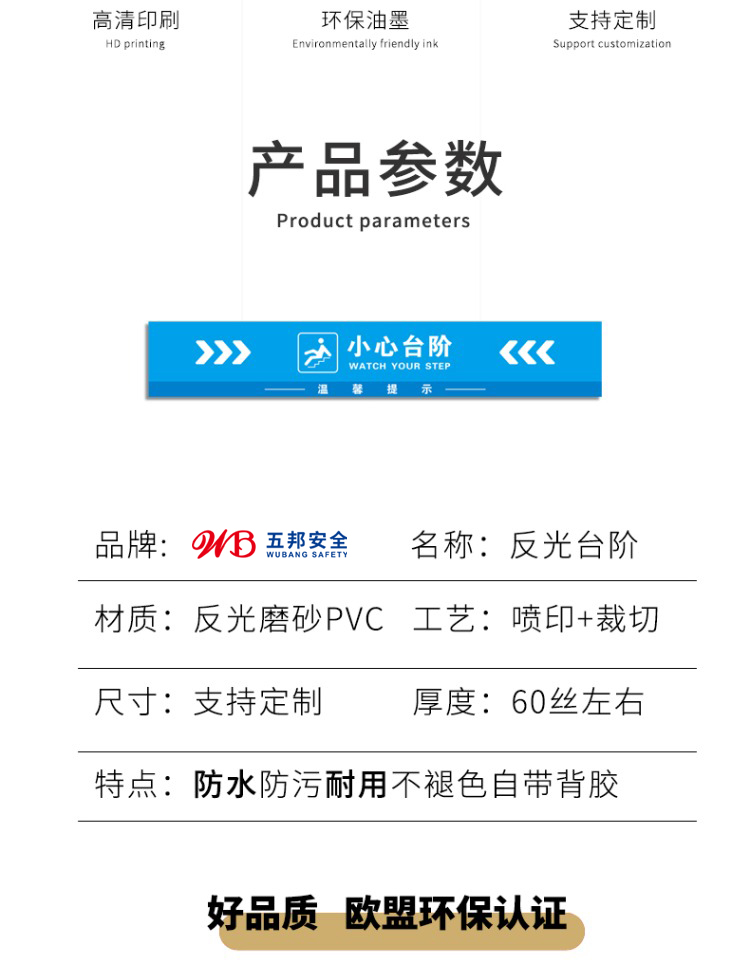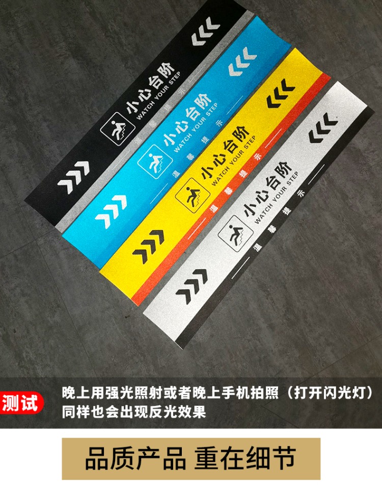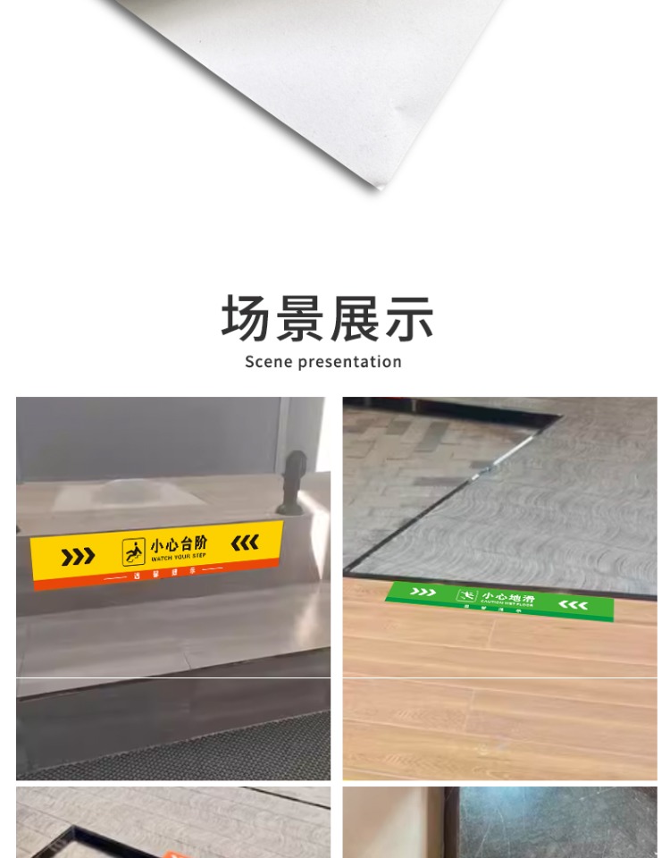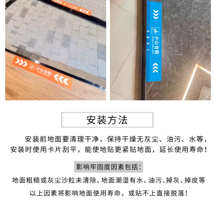 本系列安全提示貼,是您安全保障的貼心助手?!靶⌒呐_階”“地滑地貼”“注意臺階提示貼”等,適用于商場、衛(wèi)生間、樓梯等場所。采用高品質(zhì)材料制作,具有耐磨、耐臟、防水特性,自帶粘性,粘貼牢固。圖案設計醒目,文字警示清晰,能有效提醒行人注意臺階和地面狀況,減少滑倒、摔倒等意外發(fā)生。無論是保障商場顧客安全,還是維護辦公樓、學校等人員出行安全,都是您的理想選擇,為安全出行保駕護航。
