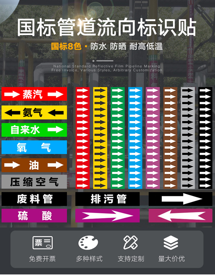 五邦專業(yè)提供管道標(biāo)識、標(biāo)簽、箭頭、色環(huán)的方案,制作,安裝服務(wù),五邦24小時(shí)恭候您的來電